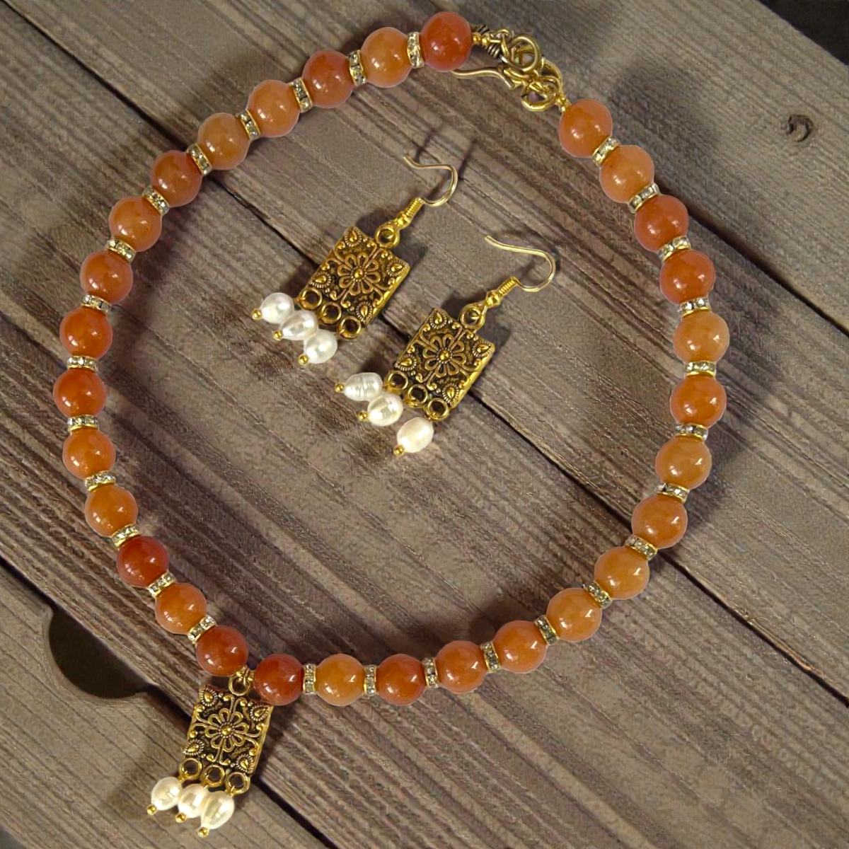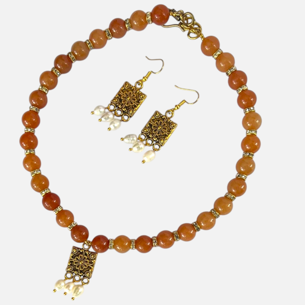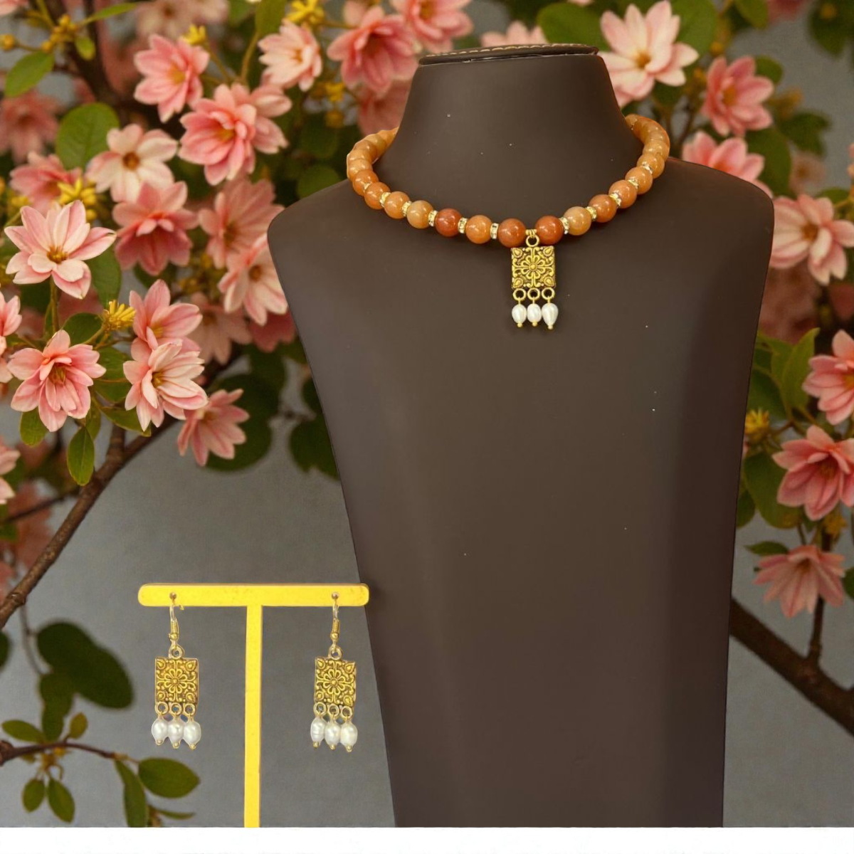 Structured necklace crafted with semi-precious stones arranged in a distinctive patterned form.