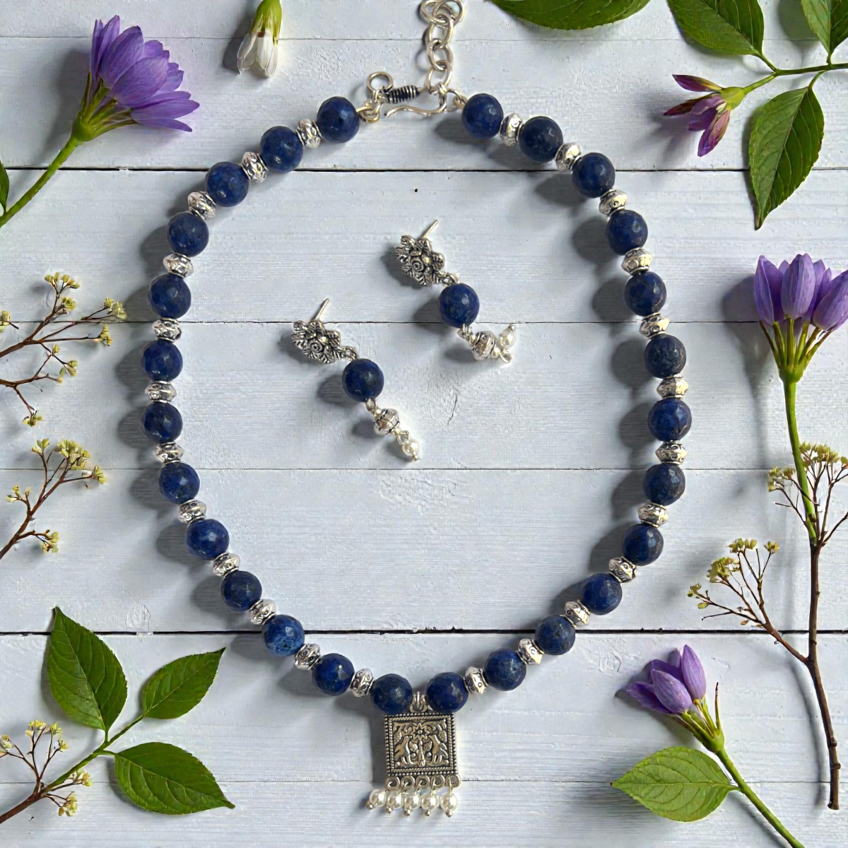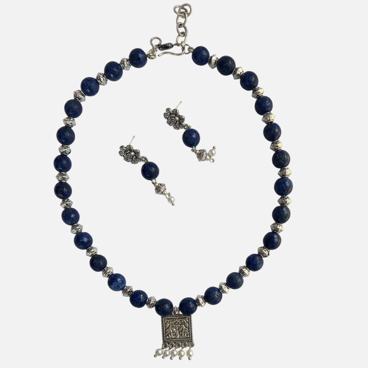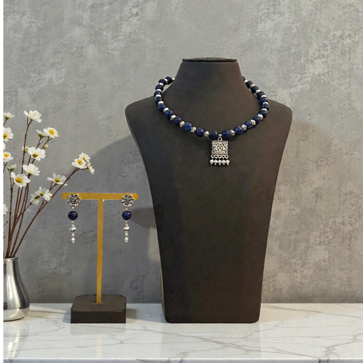 Structured necklace crafted with semi-precious stones arranged in a distinctive patterned form.